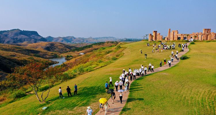 巨石陣由經(jīng)過(guò)切割的丹霞原石堆砌而成,門形石陣與水中嬌艷的荷花相互輝映,充滿了神秘而獨(dú)特的美感。在這里,建議穿著純色長(zhǎng)裙,穿梭于石拱門之間,利用光影的變幻營(yíng)造出神秘而迷人的氛圍,隨手一拍都是大片。夏季傍晚時(shí)分,這里還常有民俗表演,火把巡游的熱烈與丹霞夜景的靜謐相結(jié)合,氛圍感直接拉滿。