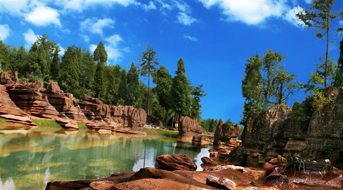 著名石景有蜀犬吠日、乳燕待哺、蝸牛搬家、樓蘭古城、七彩迷宮等等,另還有地下溶洞,絕壁天坑,千年古木等,整個(gè)景區(qū)融紅、秀、峻、奇、絕、古于一身,堪稱(chēng)“武陵第一奇觀”。