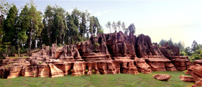 據(jù)地質(zhì)專(zhuān)家考證:紅色石林巖石形成的歷史約4。5億年,地質(zhì)史上稱(chēng)之為揚(yáng)子古海(海底沉積了大量混合泥沙的碳酸鹽物質(zhì),經(jīng)地殼運(yùn)動(dòng)和侵蝕、溶蝕作用形成了這片美麗的地質(zhì)奇觀)。景區(qū)內(nèi)遍布高大奇石,造型各異、顏色變化多端,且隨天氣、時(shí)間、季節(jié)變化而變化,晴紅雨黑、陰轉(zhuǎn)褐紅、晨昏有別。 景區(qū)內(nèi)石景有:蜀犬吠日、乳燕待哺、樓蘭古城、蝸牛搬家、七彩迷宮、利劍刺空、航母巡游、石兵列陣、少女出浴、觀音坐蓮、石鞭候主、靈龜探海、粽熊迎客、天狗吠日、水獺望云、母雞搗窩、駝鈴聲聲····尤以“巨人圓”、“古城故宮”、“八卦奇陣”、“諸葛藏書(shū)”為奇石絕景中的最佳。 景區(qū)內(nèi)還有地下溶洞、絕壁天坑、神秘地坑、千年古木、土家山寨、土風(fēng)民俗、集商遺址····