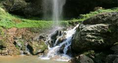 至此山窮水盡,拾級登山,奇景迭出。首先是滴水巖,水珠自幾十米高的巖上掉下,似斷線珍珠,叮咚有聲,巖壁側立千尋。晶瑩透亮,潔白如玉。自此登石壁而上,就是深不可測的銀濤峽了。