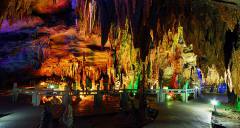 在洞內(nèi)地下河游船上你可置身于一寬度不足10米,但高達(dá)50米以上的峽谷中,而在最高處的洞頂,卻是石鐘乳垂吊如林,更若厚厚的云層蓋頂,蔚為壯觀??芍^船在水中行,人在畫(huà)中游。