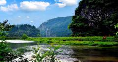 天然巖溶的湖泊,碧毯般法人草灘濕地幾顆小樹(shù)點(diǎn)綴,石峰上面藍(lán)天白云綠水,青崖植被微風(fēng)。一團(tuán)團(tuán)薄霧從石門(mén)間的睡眠浮蕩而來(lái),似是人間仙境。